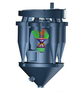 在工作状态下,高速电机通过传动装置带动立式传动轴转动,物料通过设在选粉机室上部的进料口进入选粉室内,再通过设置在中粗粉收集锥的上下两锥体之间和通粉管道落在撒料盘上,撒料盘随立式传动轴转动,物料在惯性离心力的作用下,向四周均匀撒出,分散的物料在外接风机通过进风口进入选粉室的高速气流作用下,物料中的粗重颗粒受到惯性离心力的作用被甩向选粉室的内壁面。碰撞后失去动能沿壁面滑下,落到粗粉收锥中,其余的颗粒被旋转上升的气流卷起,经过大风叶的作用区时,在大风叶的撞击下,又有一部分粗粉颗粒被抛到选粉室的内壁面,碰撞后失去动能沿壁面滑下,落到粗粉收集锥中。